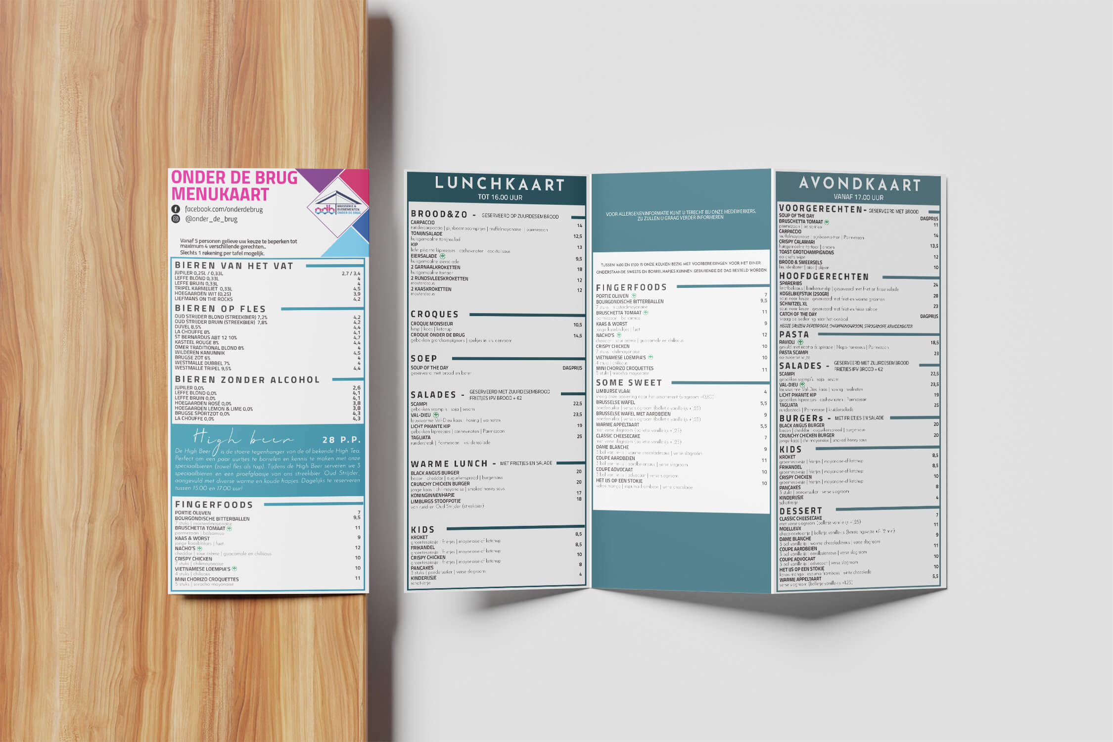 Ons ontwerp voor de menukaart is met oog voor detail gecreëerd, waarbij we de essentie van Brasserie Onder de Brug hebben gevangen. Van verrukkelijke voorgerechten tot hartige hoofdgerechten en verrassende desserts, deze menukaart biedt een uitgebreid scala aan gerechten voor elke smaak.